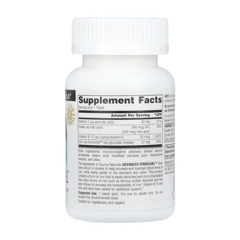 У дослідженнях було показано, що інгредієнти Advanced Ferrochel™ від Source Naturals допомагають підвищити й підтримувати рівень заліза в крові, не викликаючи подразнення шлунка й кишечника. Цей засіб містить форму заліза, що легко засвоюється та є біодоступнішою за інші форми заліза, як-от сульфат заліза. Аскорбінова кислота показала свою здатність підвищувати біодоступність заліза. Вітамін B12 і фолієву кислоту включено до складу для додаткової підтримки.