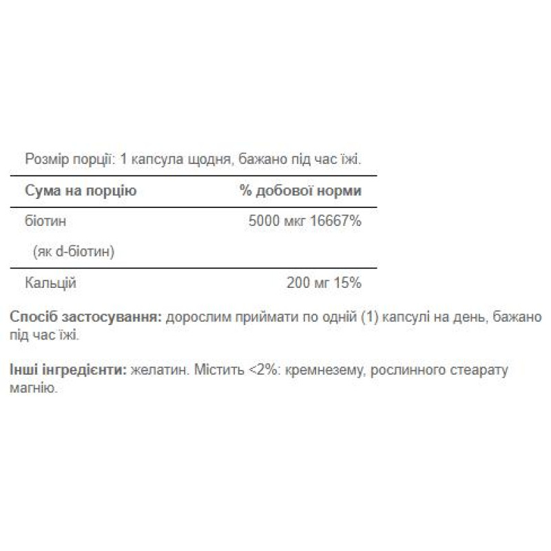 Зверніть увагу, що Biotin 5000 mcg - 60 caps не є лікарським засобом. Не замінює повноцінного харчування. Не перевищуйте рекомендовану добову дозу. Використовуйте згідно з інструкцією виробника, яка є на упаковці або всередині неї.