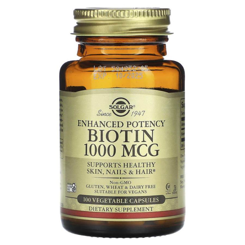 Біотин: водорозчинний вітамін групи B, також відомий як вітамін B7 або H. Він бере участь у метаболізмі макроелементів, перетворюючи вуглеводи, білки та жири на енергію. Біотин необхідний для роботи ферментів, які беруть участь у синтезі жирних кислот та глюкози. Цей вітамін включається до складу багатьох добавок для догляду за шкірою, волоссям та нігтями. Дефіцит біотину може виявлятися у вигляді сухості шкіри, ламкості нігтів або випадання волосся. Продукт від Solgar надає дозування, достатнє для заповнення добової потреби.