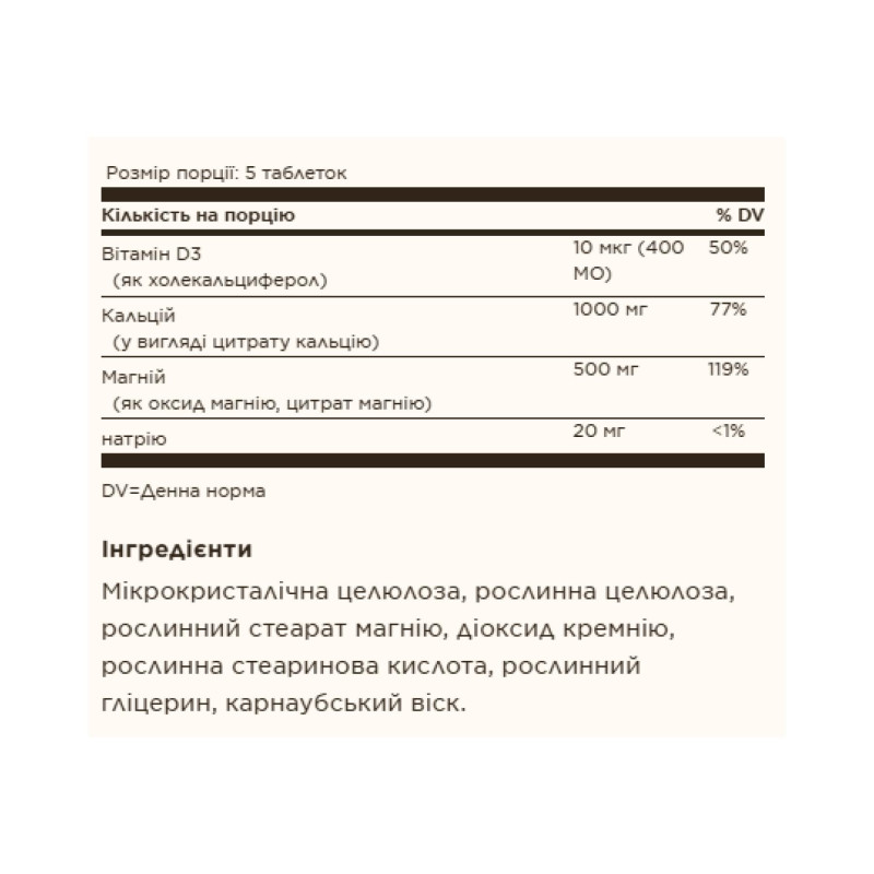 Кальцій є будівельним матеріалом, який допомагає підтримувати міцність і здоров’я кісток і зубів. Він також підтримує здоров’я кістково-м’язової та нервової систем. Магній допомагає регулювати транспорт кальцію та стимулює секрецію кальцитоніну, гормону, який сприяє притоку кальцію в кістку. Вітамін D необхідний для сприяння засвоєнню кальцію, що допомагає підтримувати здоров’я кісток і зубів. Вітамін D також підтримує здорову імунну систему. Ця формула містить вітамін D3 для щоденної добавки.