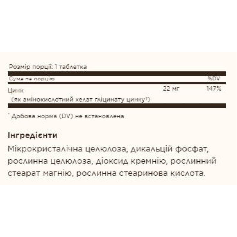 Зверніть увагу, що Chelated Zinc - 100 tabs не є лікарським засобом. Не замінює повноцінного харчування. Не перевищуйте рекомендовану добову дозу. Використовуйте згідно з інструкцією виробника, яка є на упаковці або всередині неї.