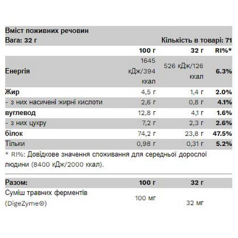 Інгредієнти (Шоколадний фундук): мікрофільтрований концентрат сироваткового білка (з молока, інстантизований соняшниковим лецитином), мікрофільтрований концентрат сироваткового білка (з молока, інстантизований соєвим лецитином), L-гліцин, сухе знежирене молоко, мальтодекстрин, какао-порошок зі зниженим вмістом жиру, ароматизатори (шоколадний смак, аромат лісового горіха), хлорид натрію, загущувач (ксантанова камедь), L-таурин, L-глутамін, підсолоджувачі (ацесульфам К, сукралоза), ферментний комплекс Digezyme® (альфа-амілаза, нейтральна) протеаза, целюлаза, лактаза, ліпаза)