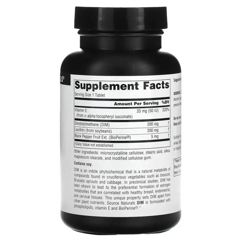 ДІМ— це фітохімічний індол, який є природним метаболітом сполук, що містяться в овочах сімейства хрестоцвітних, таких як броколі, брюссельська капуста та качанна капуста. Доклінічні дослідження показали, що ДІМ сприяє утворенню метаболітів естрогену, які допомагають підтримувати здоров'я тканин молочних залоз, внутрішньоматкових і цервікальних тканин. Ця унікальна властивість відрізняє ДІМ від інших поживних рослинних речовин. ДІМ від Source Naturals містить фосфоліпіди, вітамін Е та BioPerine®.
