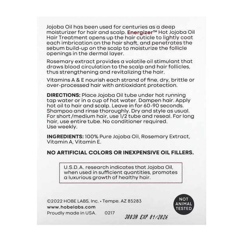 Протягом століть олія жожоба використовувалась для глибокого зволожування волосся та шкіри голови. Лікування волосся з гарячою олією жожоба Energizer™ відкриває кутикулу волосся, щоб злегка покрити кожний міліметр пасма, і проникає під накопичення сала на шкірі голови, таким чином зволожуючи відкриті фолікули у дермальному шарі.