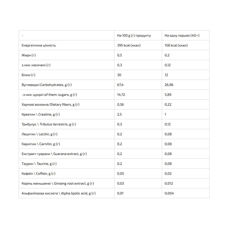Склад: білки сироваткові (концентрат, ізолят та гідролізат сироваткового білка) - 30%, мальтодекстрин, фруктоза, креатин - 2,5%, *порошок сублімованих ягід/фруктів (ідентичні найменуванню смаку на упаковці) або какао-порошок знежирений (*в залежності від смаку, вказаного на упаковці), екстракт трибулусу - 0,3%, аргінін - 0,25%, лецитин - 0,2%, таурин - 0,2%, карнітин - 0,2%, екстракт гуарани - 0,2%, глютамін - 0,1%, кофеїн - 0,05%, гліцин - 0,05%, екстракт женьшеню - 0,03%, премікс вітамінний - 0,03% (вітамін С, вітамін РР, вітамін Е, вітамін В5, вітамін В6, вітамін В2, вітамін В1, фолієва кислота (вітамін В9), біотин (вітамін В7), вітамін В12), кислота альфаліпоєва - 0,01%, орнітин моногідрохлорид - 0,003%, ароматизатор харчовий (ідентичний найменуванню смаку на упаковці), барвник харчовий.