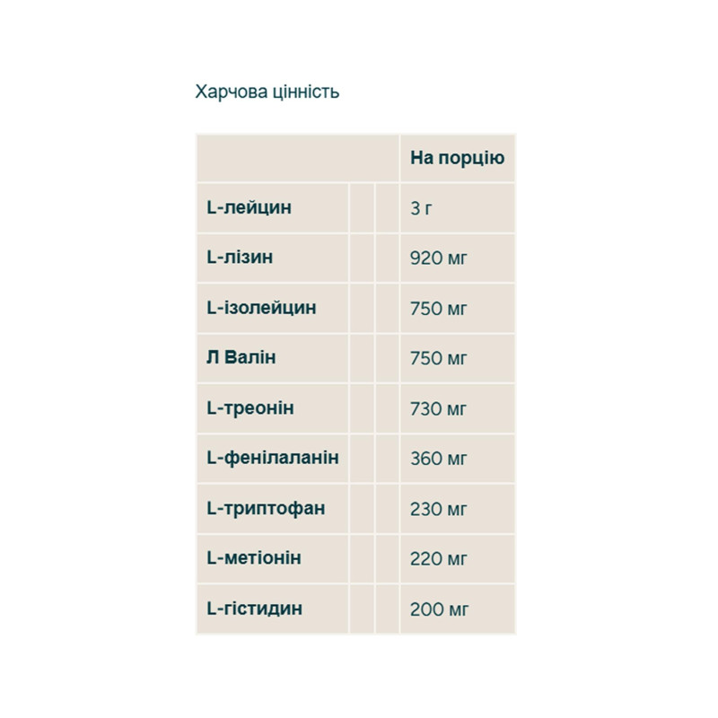 РЕКОМЕНДОВАНЕ ВИКОРИСТАННЯ: Змішайте 7,0 г (приблизно 2 мірні ложки) з 300 мл води або соку до, під час або після тренування. Вживайте один раз на день. Порошок з часом осяде. Для точного вимірювання рекомендуємо зважувати порошок.