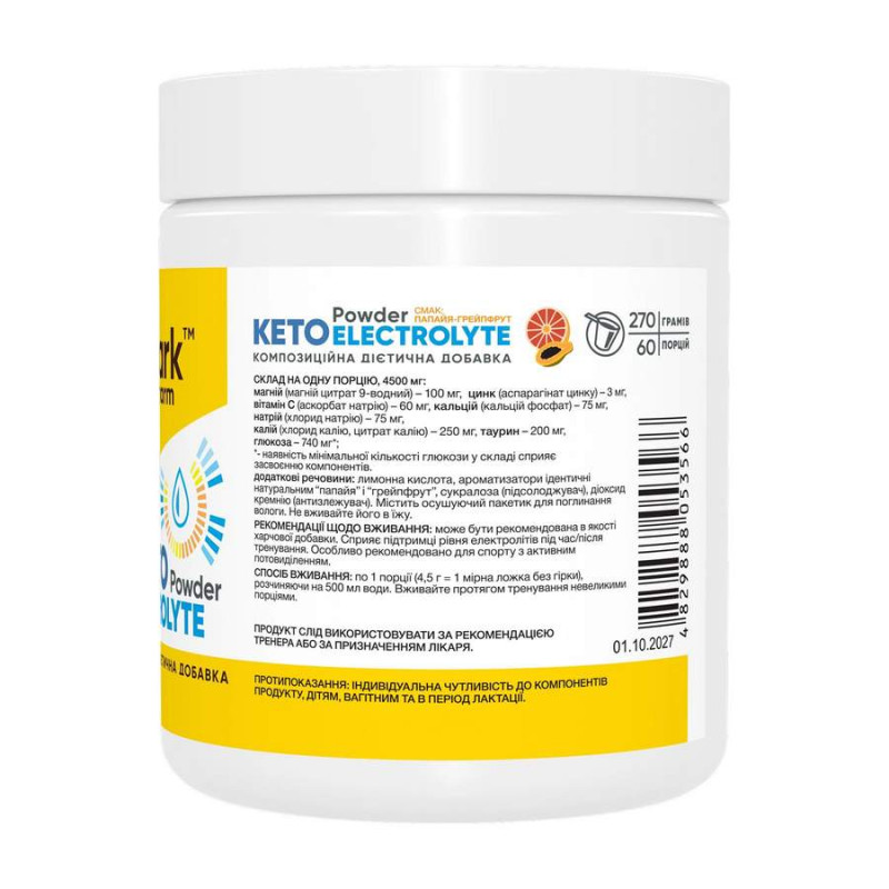 Зверніть увагу, що Keto Electrolyte Powder - 270g Papaya-Grapefruit не є лікарським засобом. Не замінює повноцінного харчування. Не перевищуйте рекомендовану добову дозу. Використовуйте згідно з інструкцією виробника, яка є на упаковці або всередині неї.
