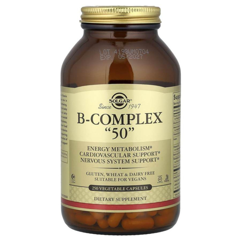 B-Complex "50" від Solgar - це високоякісна добавка, що містить вітаміни групи B, які відіграють ключову роль у різних процесах, що відбуваються в організмі. Комплекс розроблений для задоволення потреб у вітамінах цієї групи та підтримки загального добробуту та здоров'я організму.