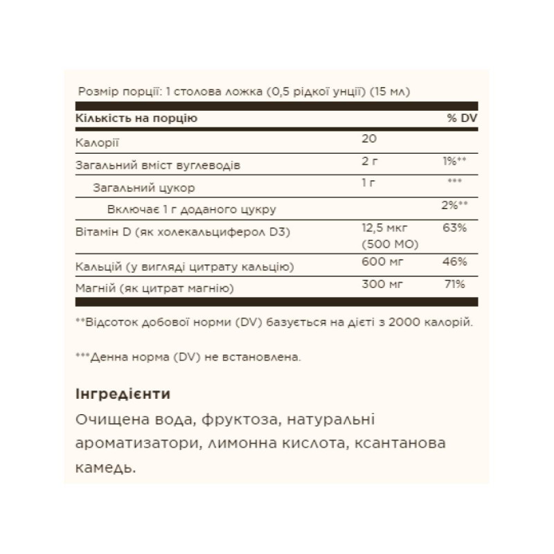Кальцій забезпечує будівельні блоки, які допомагають підтримувати міцність і здоров’я кісток і зубів. Він також важливий для належного функціонування опорно-рухового апарату та нервової системи. Магній допомагає регулювати транспортування кальцію та стимулює секрецію кальцитоніну — гормону, який сприяє надходженню кальцію в кістки. Вітамін D необхідний для засвоєння кальцію, який допомагає підтримувати здоровий стан кісток і зубів. Вітамін D також підтримує здоров’я імунної системи. Ця формула постачає кальцій, магній і вітамін D3 у смачній і легкій для засвоєння рідкій формі для щоденних добавок.