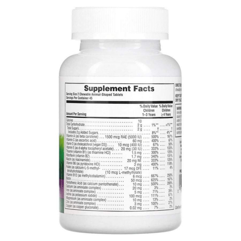 Натуральні підсолоджувачі (тростинний цукор без ГМО, фруктоза), целюлоза (рослинного походження), лимонна кислота, натуральні барвники (виноград, буряк), карбонат кальцію, стеарат магнію, натуральні ароматизатори, фумарат заліза, оксид магнію, спіруліна (природно багата необхідними поживними речовинами), оксид цинку, плоди шипшини (Rosa canina), цитрат калію, цільнозерновий бурий рис, плоди папаї, йодид калію, морква, плоди мальпігії (Malpighia glabra), бітартрат холіну, аміноат калію, броколі, шпинат, плоди манго і стеаринова кислота, Мінеральні аміноати — хелати з цільного коричневого рису.