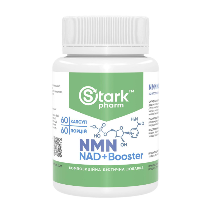 Харчова добавка Stark Pharm – Stark NMN NAD+ Booster містить нікотинаміду мононуклеотид, є сполукою, яка необхідна нашому організму для вироблення NAD+. Саме НАД+ бере участь у клітинному диханні та відповідає за метаболічне виробництво енергії, допомагаючи відновлювати пошкодження в ланцюгах ДНК.