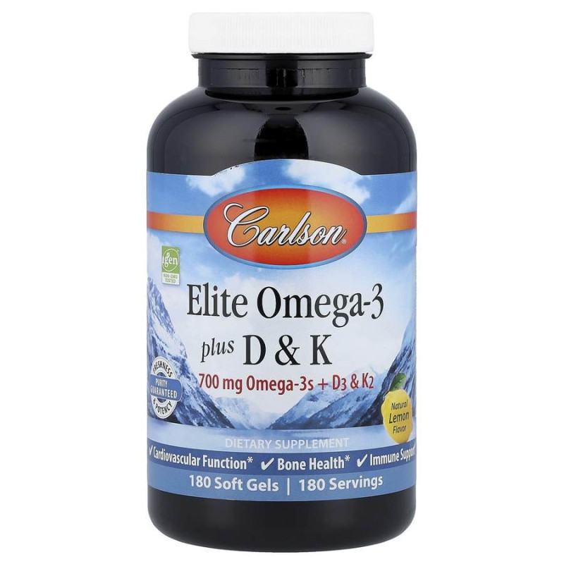 Elite Omega-3 Plus D&K від Carlson – це преміальний комплекс, що поєднує омега-3 жирні кислоти, вітамін D3 та вітамін K2 (MenaQ7®). Формула створена для повноцінного харчування клітин та участі в обмінних процесах, пов'язаних зі станом судин, кісток та метаболізмом ліпідів.