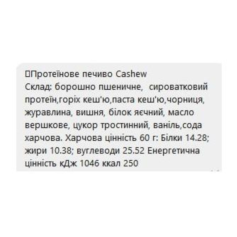 Зверніть увагу, що Protein Cookie - 60g Cashew (Поштучно) не є лікарським засобом. Не замінює повноцінного харчування. Не перевищуйте рекомендовану добову дозу. Використовуйте згідно з інструкцією виробника, яка є на упаковці або всередині неї.
