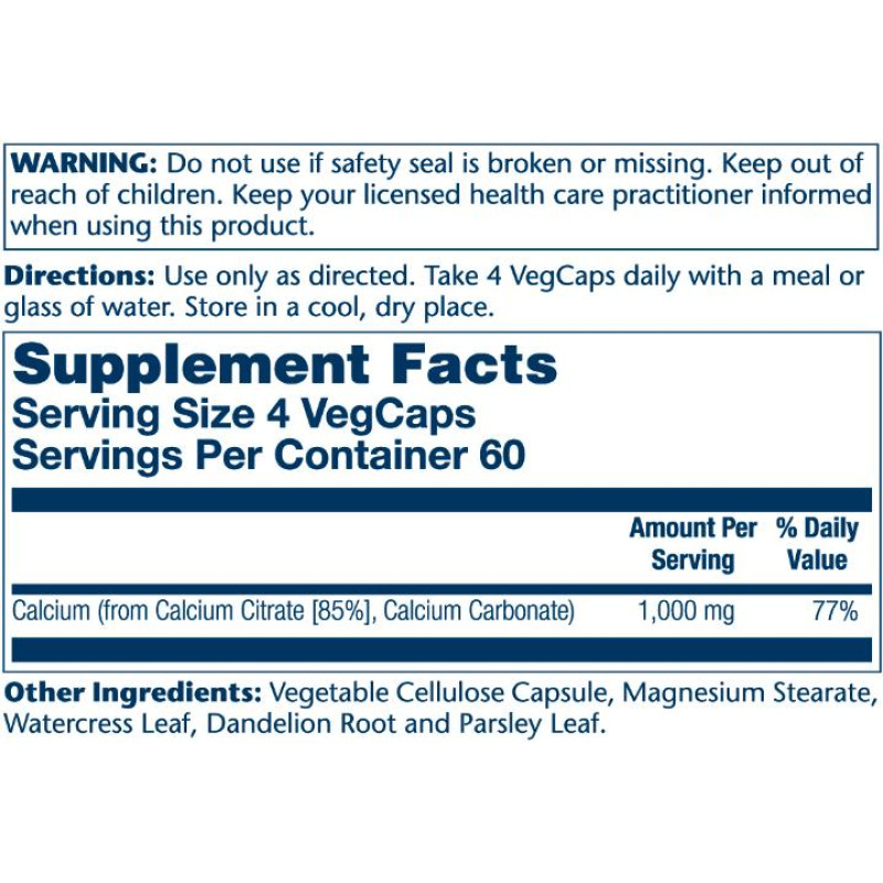 Solaray Calcium Citrate 1000mg - 120 капсул - это диетическая добавка, содержащая кальций в легкоусвояемой форме цитрата. Кальций важен для:
