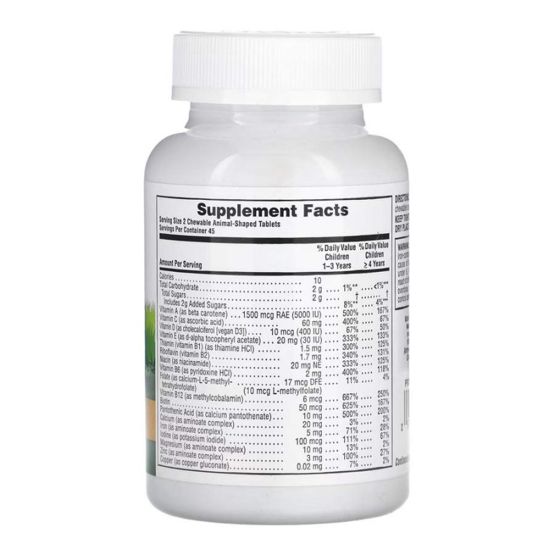 Натуральные подсластители (сахар без ГМО, фруктоза), натуральные ароматизаторы, микрокристаллическая целлюлоза, растительная целлюлоза, лимонная кислота (для ароматизатора), натуральный краситель (анато, виноград, свекольный сок, куркумин), карбонат кальция, магния стеарат, гуа , оксид магния, спирулина (естественно богатая необходимыми питательными веществами), оксид цинка, плоды шиповника (Rosa canina), цитрат калия, рисовые отруби, плоды папаи, бурые водоросли, морковь, плоды мальпигии (Malpighia glabra , аминоат калия, битартрат холина и стеариновая кислота. Минеральные аминоаты – хелаты из цельного коричневого риса.