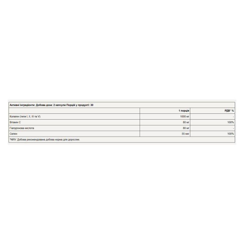 Состав: гидролизованный бычий коллаген, оболочка капсулы [бычий желатин, очищенная вода, краситель (оксиды и гидроксиды железа)], L-аскорбиновая кислота, гиалуронат натрия, обогащенные селеном сухие дрожжи, агент против слеживания (магниевые соли жирных кислот).