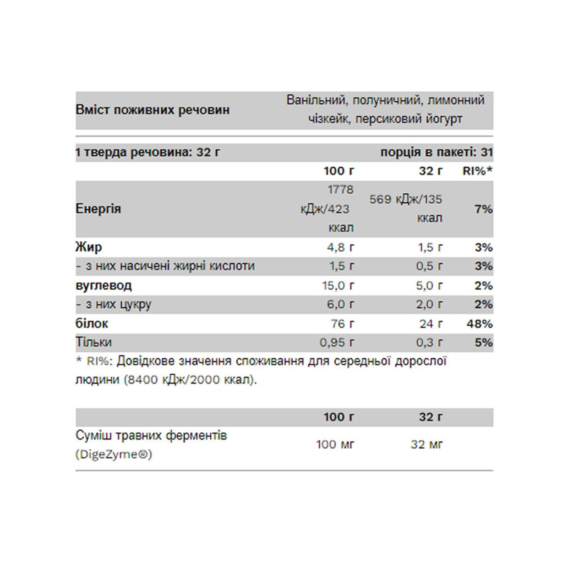 Ингредиенты (Шоколадный фундук): микрофильтрованный концентрат сывороточного белка (из молока, инстантизированный подсолнечным лецитином), микрофильтрованный концентрат сывороточного белка (из молока, инстантизированный соевым лецитином), L-глицин, сухое обезжиренное молоко, мальтодек. ароматизаторы (шоколадный вкус, аромат лесного ореха), хлорид натрия, загуститель (ксантановая камедь), L-таурин, L-глутамин, подсластители (ацесульфам К, сукралоза), ферментный комплекс Digezyme® (альфа-амилаза, нейтральная) протеаза, целлюлаза