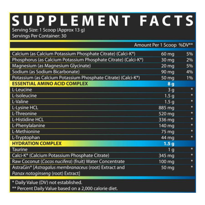 Размер порции: 1 мерная ложка (около 13 г) Количество порций в упаковке: 30 Количество на порцию %DV Кальций (в виде цитрата фосфата кальция и калия) (Calci-K™) 60 мг 5% Фосфор (в виде цитрата фосфата кальция-калия) (Calci-K™) 30 мг 2% Магний (в виде глицината магния) 20 мг 5% Натрий (в виде бикарбоната натрия) 90 мг 4% Калий (в виде цитрата кальция фосфата калия) (Calci-K™) 50 мг 1% КОМПЛЕКС НЕЗАМЕНИМЫХ АМИНОКИСЛОТ 8 г L-лейцин 3 г * L-изолейцин 1,5 г * L-валин 1,5 г * L-лизин гидрохлорид 884,75 мг * L-треонин 520,05 мг * L-гистидин гидрохлорид 335,94 мг * L-фенилаланин 139,88 мг * L-метионин 75 мг * L-триптофан 44,38 мг * УВЛАЖНЯЮЩИЙ КОМПЛЕКС 1,5 г Таурин 1 г * Calci-K™ (цитрат фосфата кальция и калия) 345 мг * Сырой кокос ( Cocos nucifera) (фрукты ) Водный концентрат 100 мг * AstraGin™ [экстракт Astragalus membranaceus (корень) и экстракт Panax notoginseng (корень)] 50 мг * *Дневная норма (DV) не установлена. ДРУГИЕ ИНГРЕДИЕНТЫ: лимонная кислота, мальтодекстрин, натуральные и искусственные ароматизаторы, диоксид кремния, сукралоза. ПРЕДУПРЕЖДЕНИЕ О АЛЛЕРГЕНАХ: орехи (кокос).
