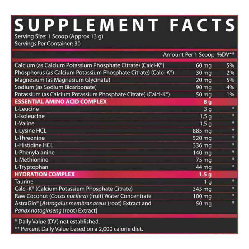Размер порции: 1 мерная ложка (около 13 г) Количество порций в упаковке: 30 Количество на порцию %DV Кальций (в виде цитрата фосфата кальция и калия) (Calci-K™) 60 мг 5% Фосфор (в виде цитрата фосфата кальция-калия) (Calci-K™) 30 мг 2% Магний (в виде глицината магния) 20 мг 5% Натрий (в виде бикарбоната натрия) 90 мг 4% Калий (в виде цитрата кальция фосфата калия) (Calci-K™) 50 мг 1% КОМПЛЕКС НЕЗАМЕНИМЫХ АМИНОКИСЛОТ 8 г L-лейцин 3 г * L-изолейцин 1,5 г * L-валин 1,5 г * L-лизин гидрохлорид 884,75 мг * L-треонин 520,05 мг * L-гистидин гидрохлорид 335,94 мг * L-фенилаланин 139,88 мг * L-метионин 75 мг * L-триптофан 44,38 мг * УВЛАЖНЯЮЩИЙ КОМПЛЕКС 1,5 г Таурин 1 г * Calci-K™ (цитрат фосфата кальция и калия) 345 мг * Сырой кокос ( Cocos nucifera) (фрукты ) Водный концентрат 100 мг * AstraGin™ [экстракт Astragalus membranaceus (корень) и экстракт Panax notoginseng (корень)] 50 мг * *Дневная норма (DV) не установлена. ДРУГИЕ ИНГРЕДИЕНТЫ: лимонная кислота, мальтодекстрин, натуральные и искусственные ароматизаторы, диоксид кремния, сукралоза. ПРЕДУПРЕЖДЕНИЕ О АЛЛЕРГЕНАХ: орехи (кокос).