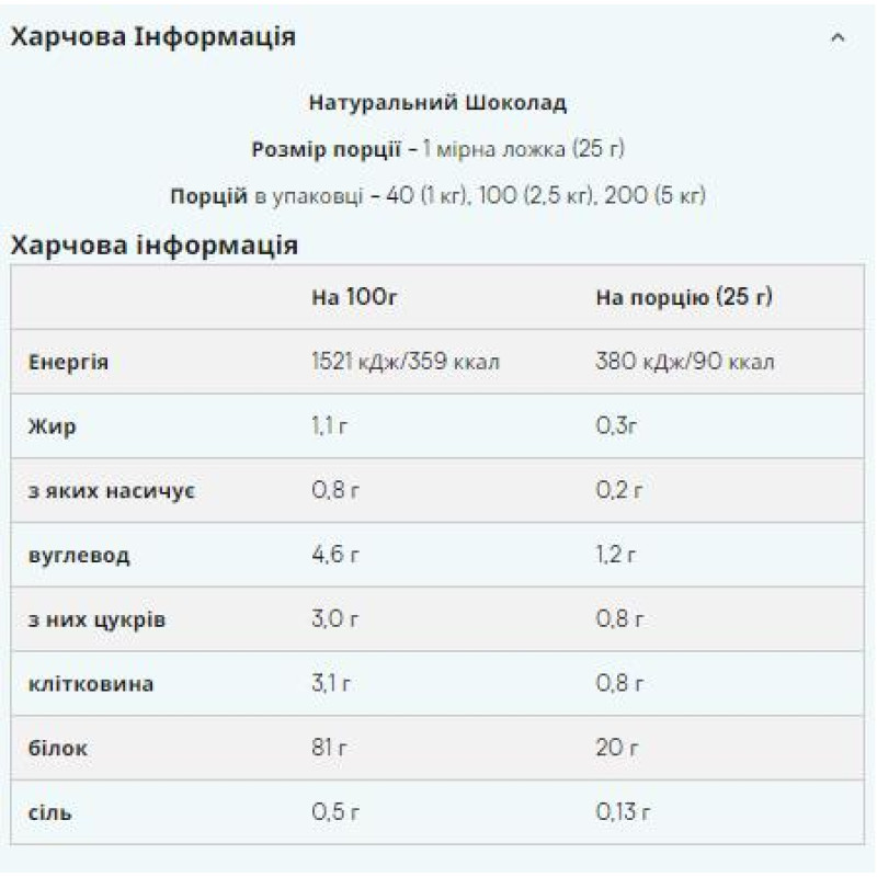 Размер порции - 1 мерная ложка (25г) Порций в упаковке - 40 (1кг), 100 (2.5кг), 160 (4кг) Питательная Ценность В 100г В порции (25г) Энергетическая ценность 1548 кДж/373 ккал 396 кДж/93 ккал Жиров 0.3 г 0.1 г из которых насыщенных 0.3 г 0.1 г Углеводов 2.5 г 0.6 г из которых сахара 2.5 г 0.6 г Белка 90 г 23 г Соли 0.50 г 0.13 г