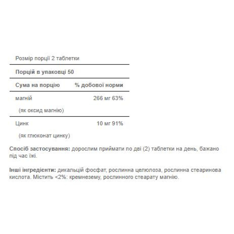 Обратите внимание, что Magnesium with Zinc - 100 tabs не является лекарственным средством. Не заменяет полноценное питание. Не превышайте рекомендуемую суточную дозу. Используйте согласно инструкции изготовителя, которая находится на упаковке или внутри нее.