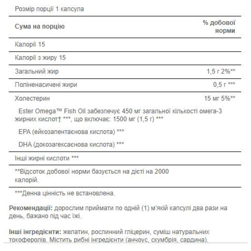 Рыбное масло Ester Omega™ содержит 450 мг жирных кислот Омега-3