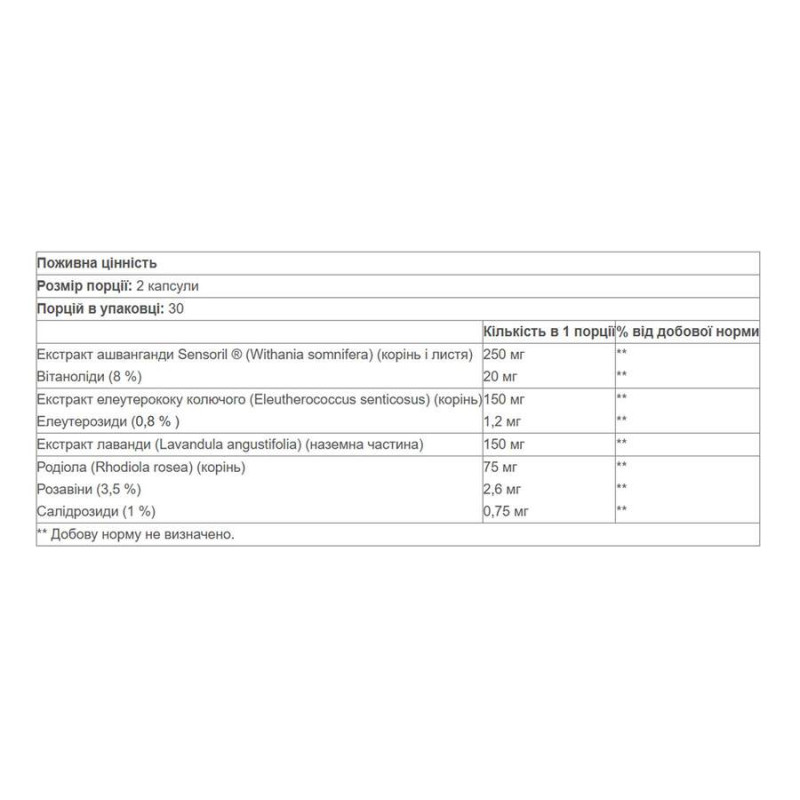 Stress-Relax ® Serenity Formula ® сочетает экстракт ашваганды Sensoril™, сибирского женьшеня, родиолы и лаванды, что помогает уменьшить симптомы стресса, такие как усталость, бессонница, раздражительность и неспособность сосредоточиться. Его гармоничное сочетание трав помогает снизить уровень кортизола и С-реактивного белка – биомаркеров физического стресса без образования привыкания.