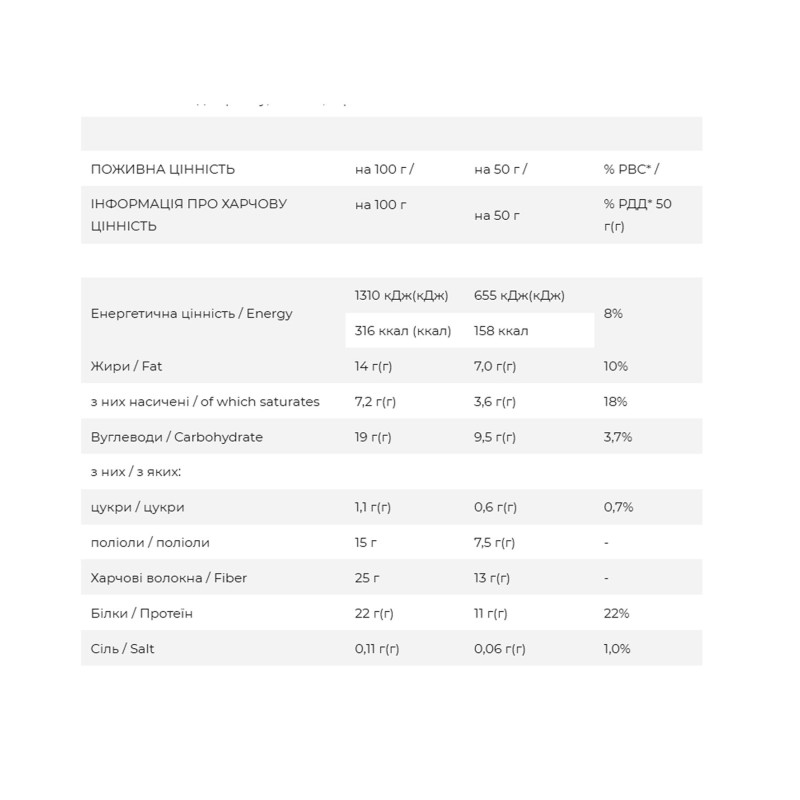 Состав: смесь растительных белков 22% (изолят соевого белка, изолят горохового белка, концентрат рисового белка, подсолнечный белок), пищевые волокна (изомальтоолигосахариды, растворимая кукурузная клетчатка), глазурь с подсластительами 26% ( какао-масло, подсластители [мальтит, стевиол-гликозиды из стевии], какао-порошок, эмульгатор: соевый лецитин, натуральный ароматизатор), кокосовое масло, подсластители (мальтит, стевиол-гликозиды из стевии), ли [изомальтоолигосахариды]), яблочное пюре, подсластитель: мальтит, концентрированный лимонный сок 0,8%, кукурузный крахмал, регулятор кислотности: лимонная кислота), алкализированный какао-порошок 3%, рисовые шарики (рисовка мука) эмульгатор: соевый лецитин, натуральный ароматизатор, морская соль, антиоксидант: витамин Е (токоферола ацетат). Может содержать следы арахиса, молока, орехов.