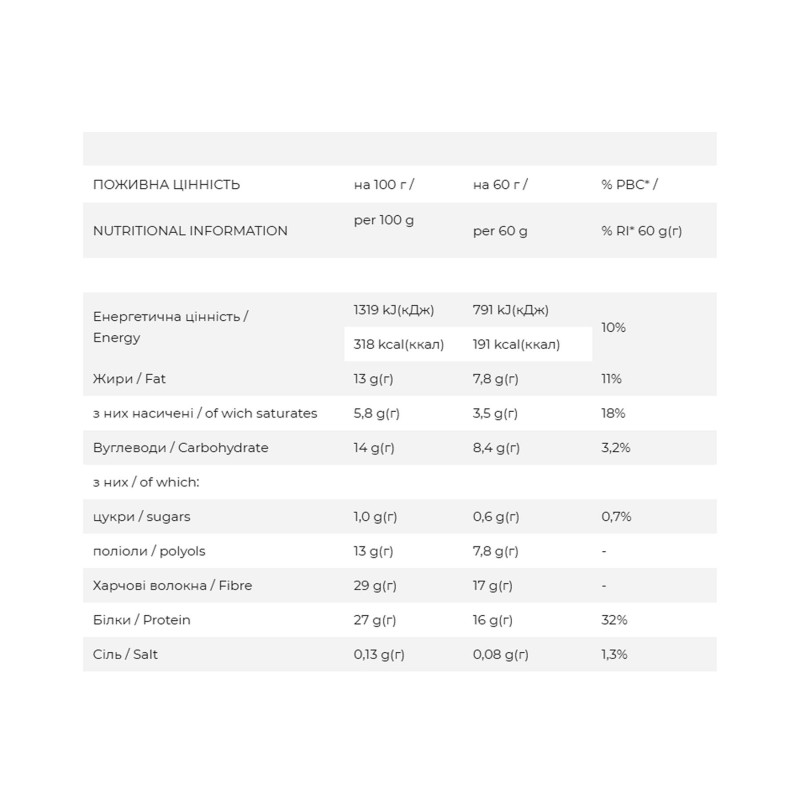 Состав: смесь растительных белков 27% (изолят соевого белка, изолят горохового белка, концентрат рисового белка), пищевые волокна (изомальтоолигосахариды, растворимая кукурузная клетчатка), глазурь с подсластителями 17% (пищевые волокна [мальтит, стевиол-гликозиды из стевии], какао-порошок, эмульгатор: соевый лецитин, натуральный ароматизатор), кокосовое масло, подсластители (мальтит, стевиол-гликозиды из стевии), соленая карамельная глазурь 16% растительные сливки, увлажнитель: растительный глицерин, загустители [карагенан, агар-агар], ароматизатор, регулятор кислотности: лимонная кислота, морская соль), алкализованный какао-порошок, увлажнитель: растительный глицерин, растворимый кофе 1,5%, эмульгатор: соевый лецитин, (токоферола ацетат). Может содержать следы арахиса, молока, орехов.