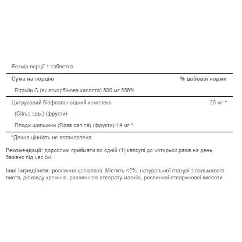 Обратите внимание, что Vitamin C-500 mg with Bioflavonoids and Rose Hips - 100 Caps не является лекарственным средством. Не заменяет полноценное питание. Не превышайте рекомендуемую суточную дозу. Используйте согласно инструкции изготовителя, которая находится на упаковке или внутри нее.
