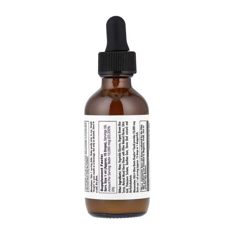 KAL Ultra Biotin — це високопотужна рідка добавка з біотином у дозі 10 000 мкг на порцію 1 мл (приблизно 15 крапель), яка у формі зі смаком «змішаних ягід» підтримує здоров’я волосся, шкіри та нігтів.