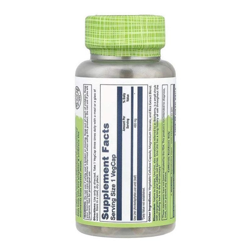 Solaray Uva Ursi — це натуральна добавка на основі листя ведмежих вушок (Arctostaphylos uva-ursi), яку традиційно використовують для підтримки здоров’я сечовидільної системи. Рослина має природні антисептичні та сечогінні властивості, допомагаючи очищенню сечового тракту та підтримці здорової функції нирок і сечового міхура.