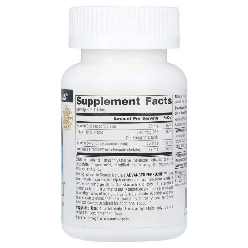 У дослідженнях було показано, що інгредієнти Advanced Ferrochel™ від Source Naturals допомагають підвищити й підтримувати рівень заліза в крові, не викликаючи подразнення шлунка й кишечника. Цей засіб містить форму заліза, що легко засвоюється та є біодоступнішою за інші форми заліза, як-от сульфат заліза. Аскорбінова кислота показала свою здатність підвищувати біодоступність заліза. Вітамін B12 і фолієву кислоту включено до складу для додаткової підтримки.